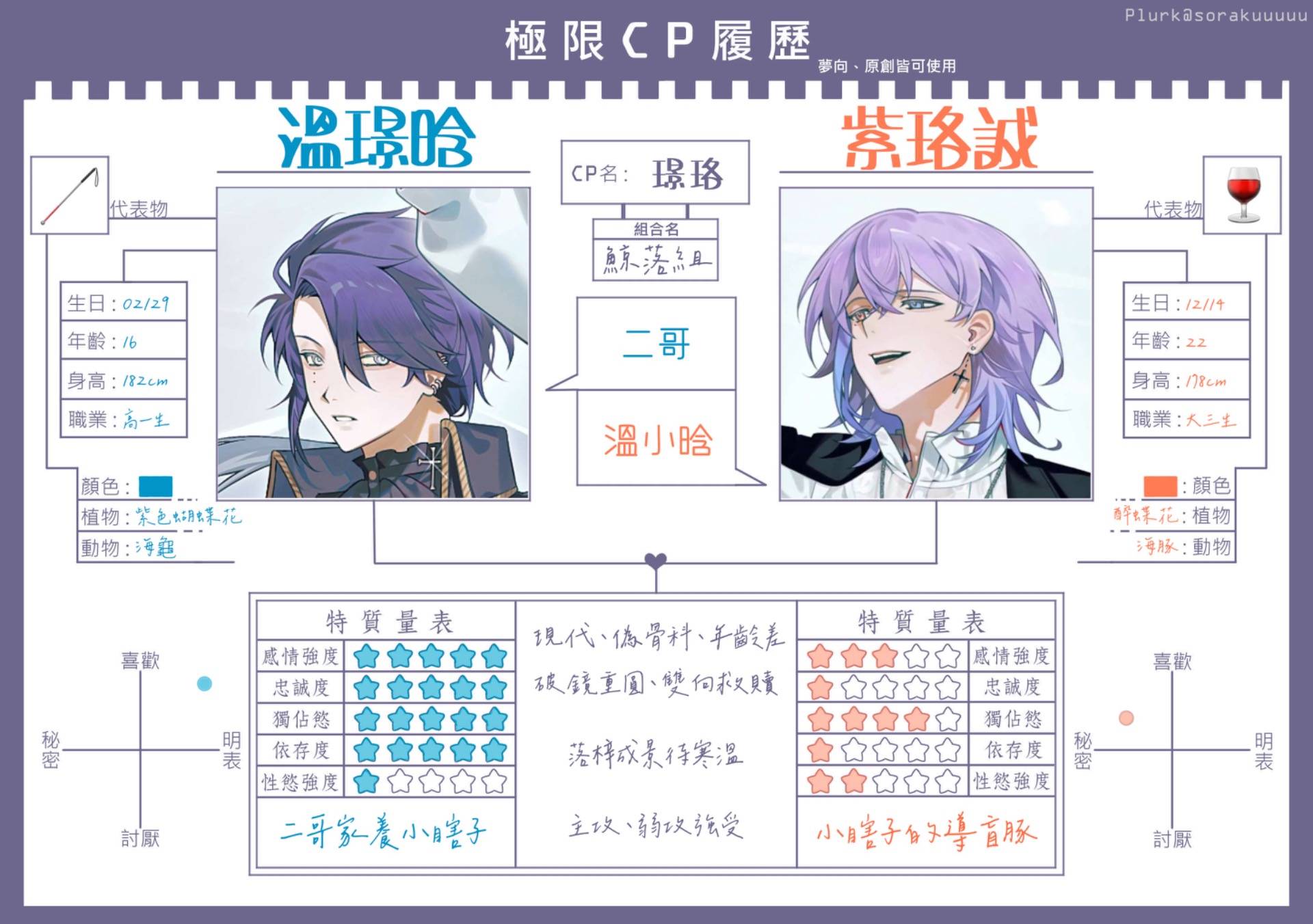 - 雖然正確的動物塑是海龜與海豚,但在兩人日常相處時,溫璟晗就像隻綠茶大狗狗很會裝可憐,紫珞誠就像那隻驕傲的貓偶爾施恩惠給溫璟晗,後者就會黏踢踢的靠過來了。